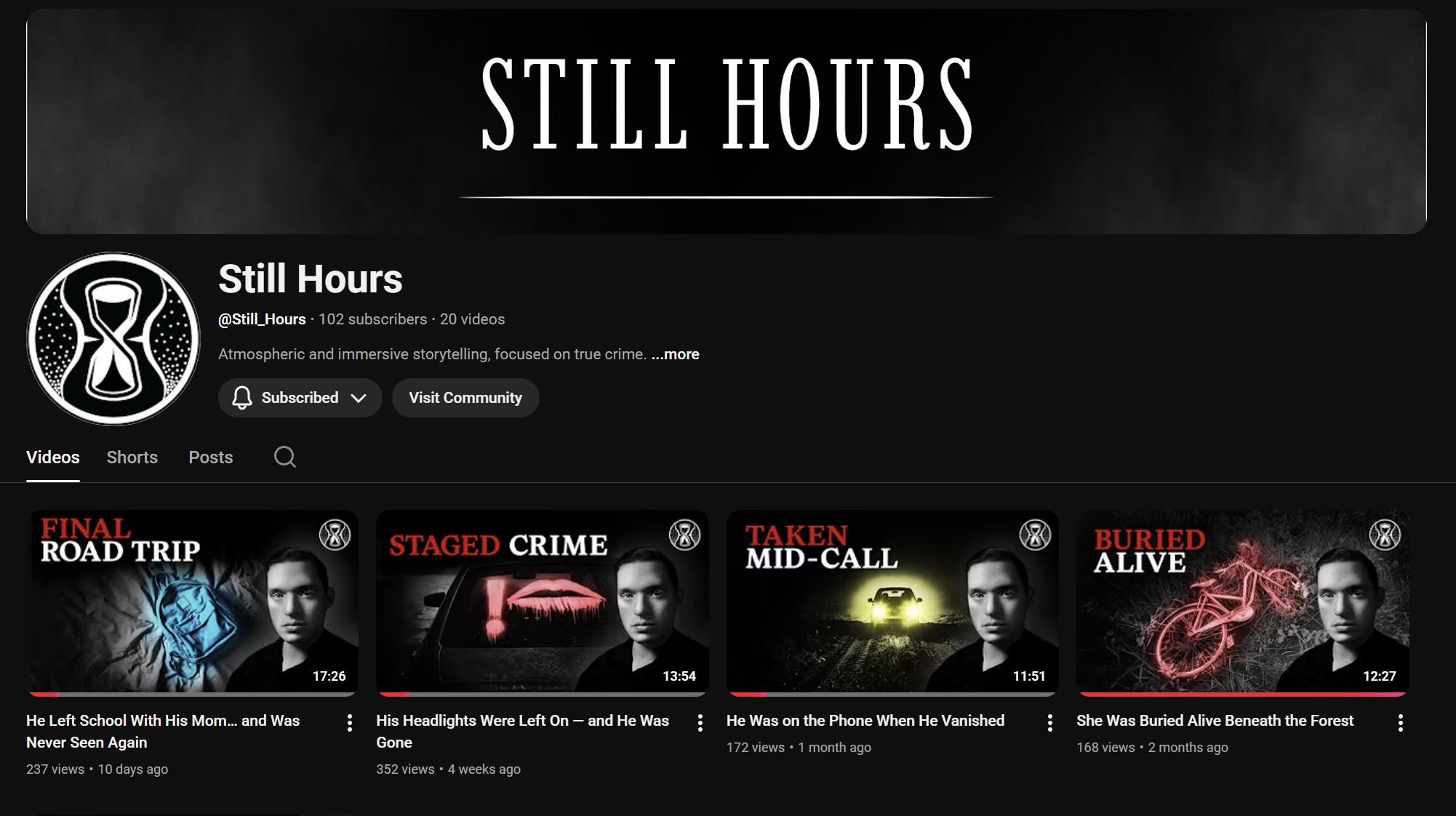 Still Hours is a cinematic true-crime media brand I created and developed from concept to full visual system. The goal was to build a consistent, recognizable visual language across thumbnails, motion graphics, typography, and long-form video presentation.